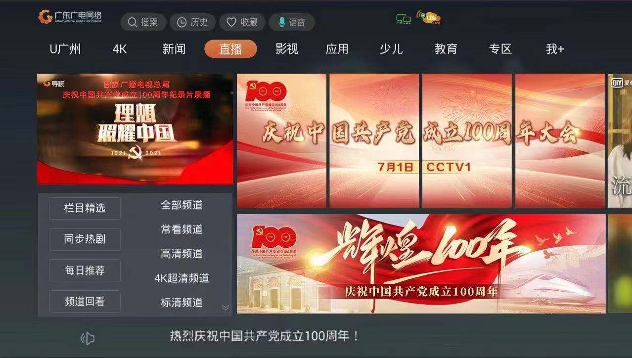 為進(jìn)一步營造中國共產(chǎn)黨成立100周年的喜慶氛圍,方便全省用戶及時(shí)收聽收看相關(guān)慶?;顒?,廣東廣電網(wǎng)絡(luò)提前謀劃直播宣傳工作,利用電視大屏、手機(jī)小屏、新媒體矩陣等宣傳平臺聯(lián)動發(fā)力,宣傳效果良好。電視大屏首屏首頁聯(lián)幅推薦,濃墨重彩宣傳重大直播。電視開機(jī)大屏于6月26日0時(shí)提前上線“熱烈慶祝中國共產(chǎn)黨成立100周年”宣傳畫面,截至6月30日24時(shí),累計(jì)宣傳超1650萬次。利用直播、4K版塊,做好慶祝中國共產(chǎn)黨成立100周年大會、《偉大征程》文藝演出、“七一勛章”頒授儀式等重大活動的直播推薦,通過多聯(lián)幅海報(bào)的方式增強(qiáng)宣傳效果。直播結(jié)束后,立即推出回看推薦,延續(xù)重大直播宣傳熱度。即時(shí)豐富“輝煌100年”專題,及時(shí)匯聚重大活動的直播視頻和相關(guān)新聞報(bào)道,滿足用戶反復(fù)收看的需要。移動端谷豆TV于6月30日晚間在首頁首幅橫版推薦位,提前上線“慶祝中國共產(chǎn)黨成立100周年大會”直播預(yù)告,并于7月1日早上對大會進(jìn)行全程同步直播;直播完成后,調(diào)整為回看推薦,用戶可進(jìn)入該推薦位,回顧觀看大會全程。7月1日下午 ,谷豆TV在首頁橫版推薦位,提前上線《偉大征程》文藝演出的直播預(yù)告,并于當(dāng)晚對文藝演出進(jìn)行全程同步直播,直播結(jié)束后即調(diào)整為回看推薦,用戶可快捷進(jìn)入回顧觀看文藝演出全程。新媒體矩陣完成“慶祝中國共產(chǎn)黨成立100周年大會”、“七一勛章頒授大會”等重要活動直播預(yù)告宣傳,同時(shí)配合推送紅色影視、廣東本土慶?;顒觿討B(tài),豐富七一主題宣傳內(nèi)容;6月28日至6月30日,累計(jì)推送圖文內(nèi)容10條。